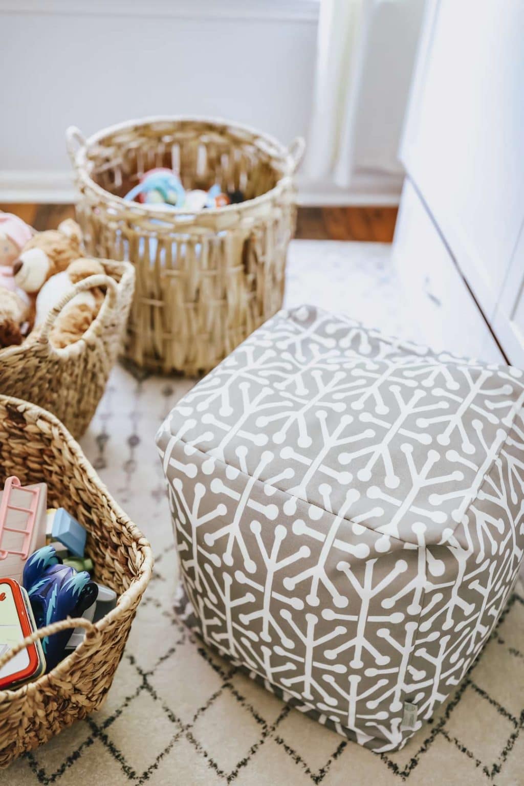 I’ll just casually lean on this pouf and pose next to these baskets for you guys before my kids come in & knock everything down, lol. Our playroom usually looks like a tornado, but the baskets do help. Just don’t look on the opposite side of the room, ok? Ha!